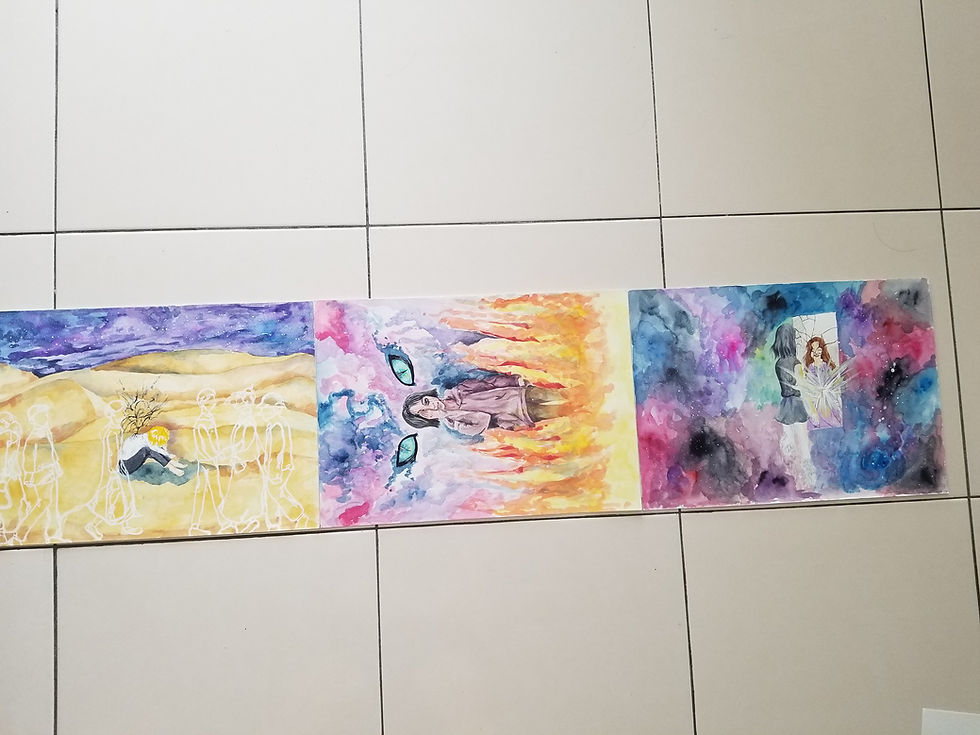 The drawing represent the three different emotions, where the painting with a blonde boy represents sadness, the middle drawing with a short cut hair girl represents the anger and the last drawing of a girl with broken mirror represents the feelings of last hope.Which are the three different sequence that a person have experience after being betrayed and left alone.
